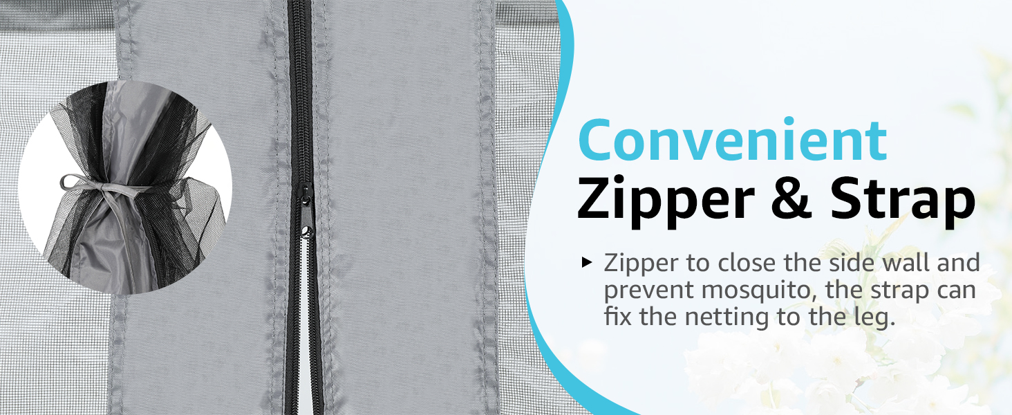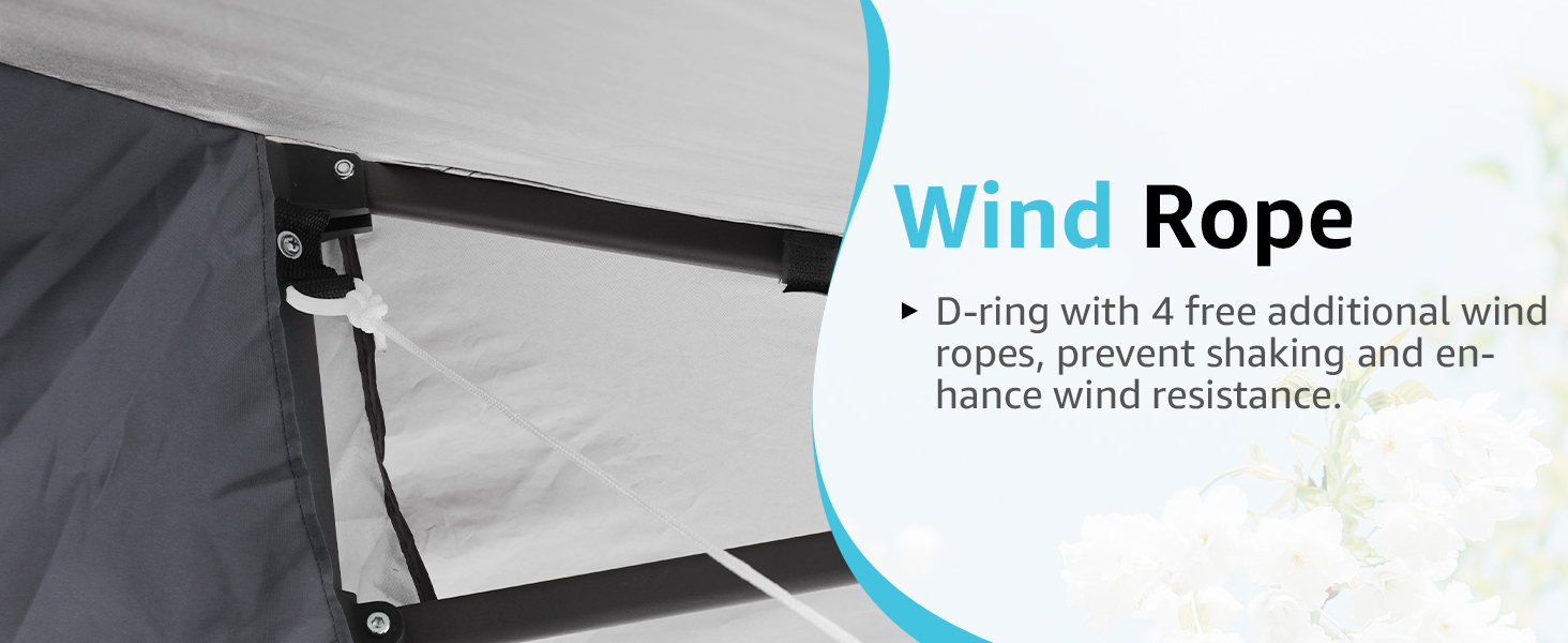 - More Stable & Privacy-Stakes to secure the outdoor gazebo into the ground for more stability and ropes help withstand the wind better. The four side walls are designed with straps and hooks to fix the legs well. Zippers in netting protect you from the sun and rain while providing you with a comfortable and private space