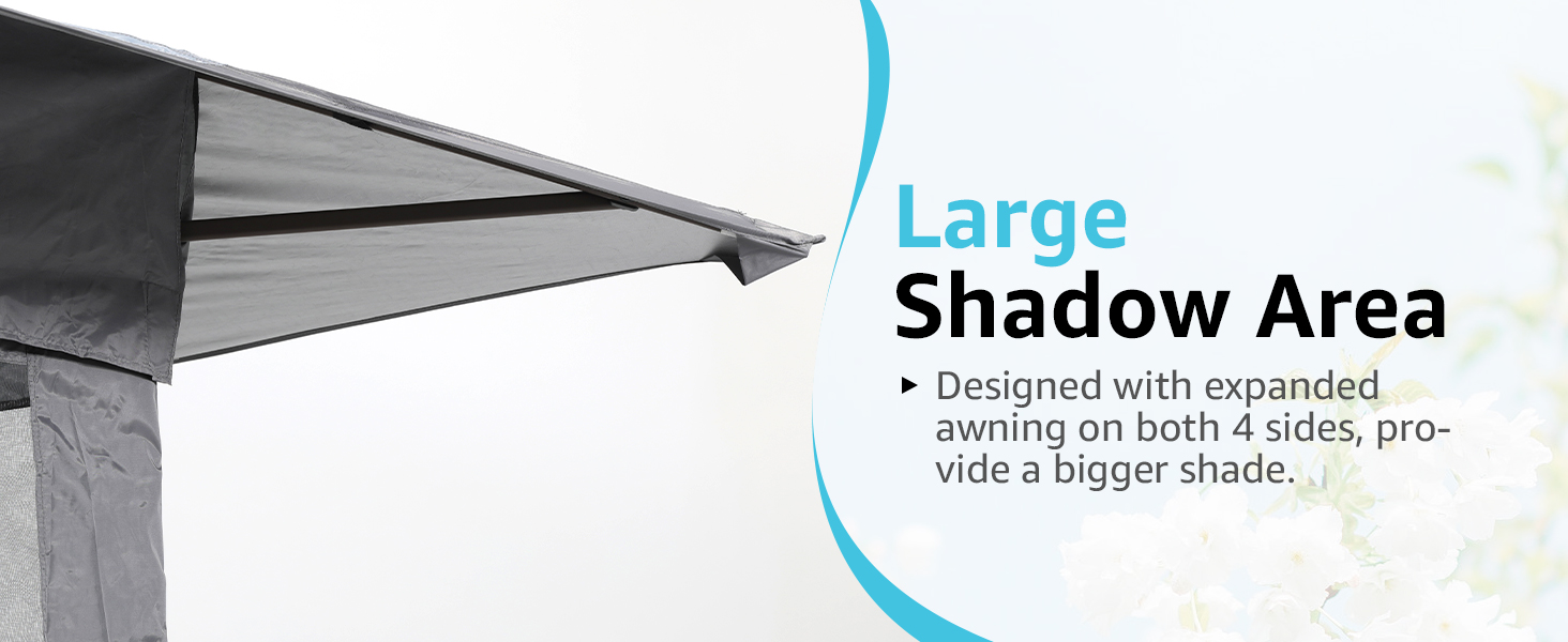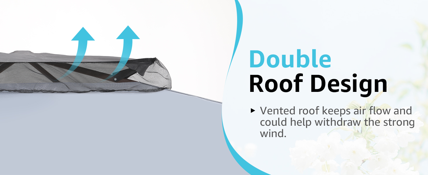 - Double Roof Design-2-tier canopy top with a wind vent, helps to enhance the air circulation inside the gazebo and provides the gazebo with more stability. With 4 drain holes on the fabric, will not hold water, keeping this shelter always dry for a longer service
