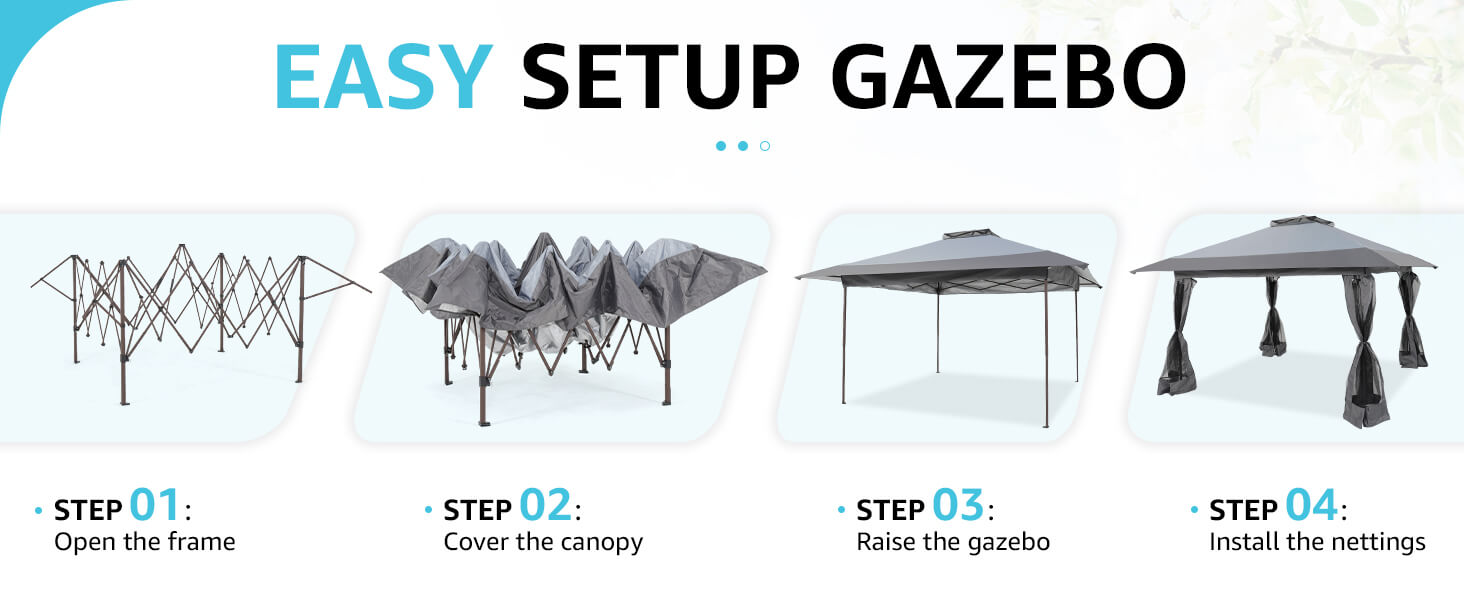 - Easy Setup & Wide Use-Setup is efficient and hassle-free, including all the necessaries and instructions, it’s easy installation and disassembly. This spacious gazebo is suitable for the home garden, playground, party, activities, camping, backyard events, etc.