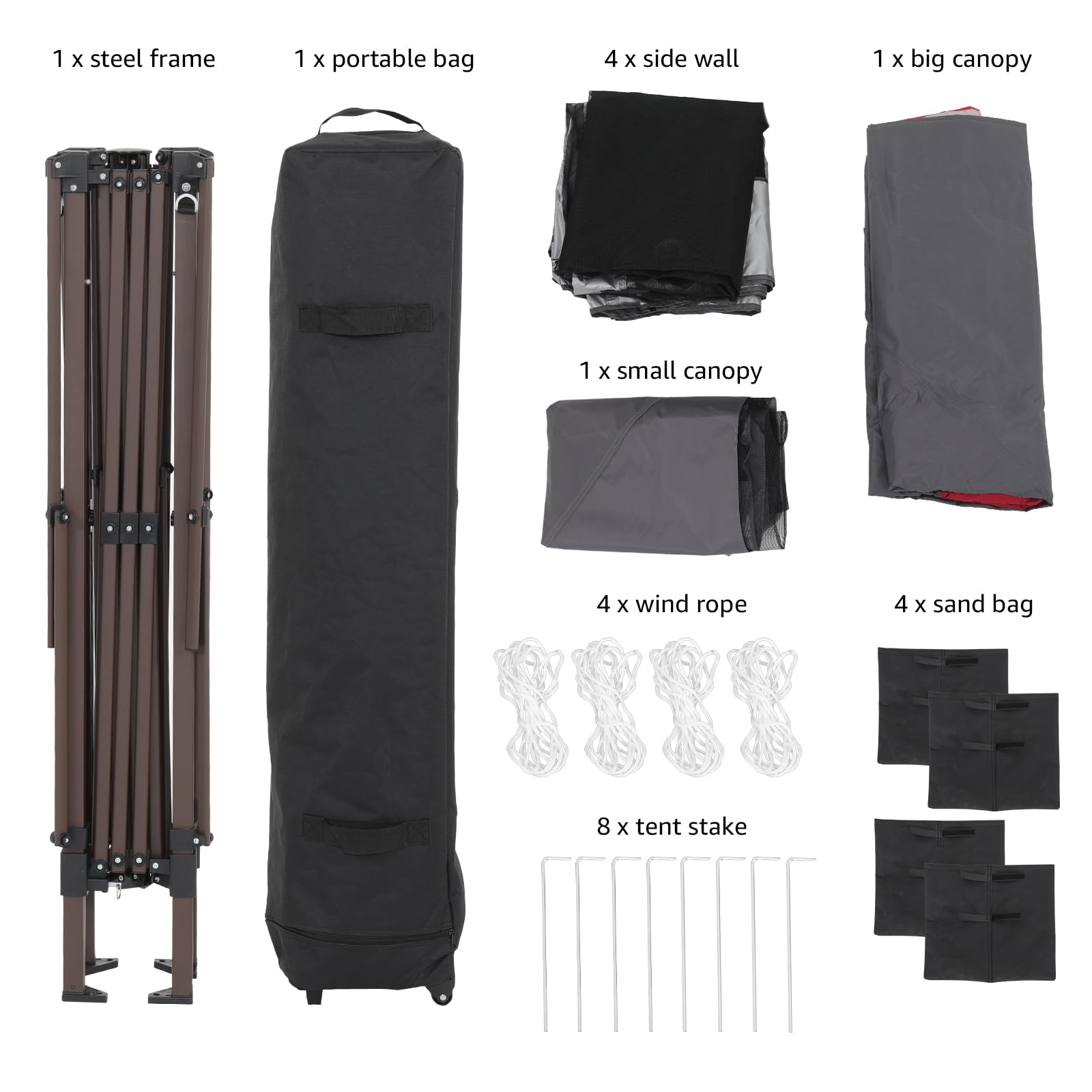 | Size | 10’x10’ straight leg frame and 13’x13’ large canopy |