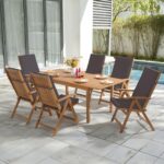 7 pcs Outdoor FSC Certified Acacia Wood Dining Set, 6 Foldable Reclining Chair and Extendable Dining Table