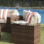 The Halo collection comes with Half Moon Design, premium olefin fabric, and handcrafted all-weather wicker. The elegant synthetic wicker is handwoven into complex patterns that give the patio furniture set its refined look. The striped pillows add a touch of elegance and style to your patio, garden, backyard, porch sunroom, or pool.