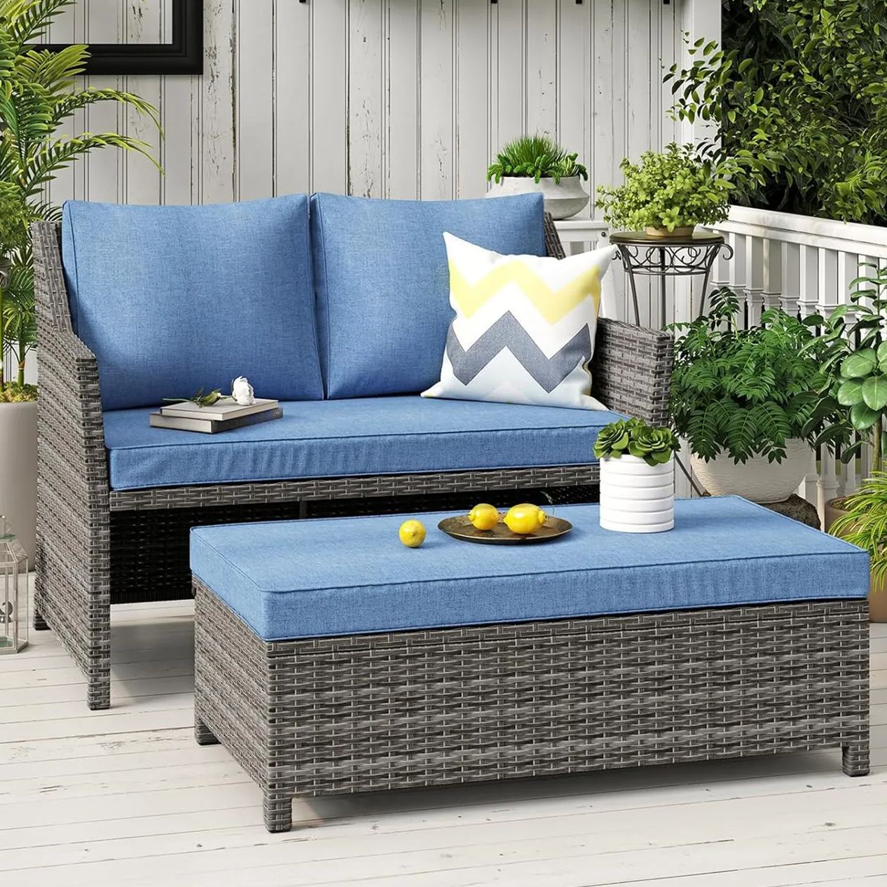 - Quick Assembly–Package Includes 1 x Loveseat;1 x Coffee Table; 2 x seat cushions and 2 x pillows. Assembly is easy with included clear instructions and necessary hardware.